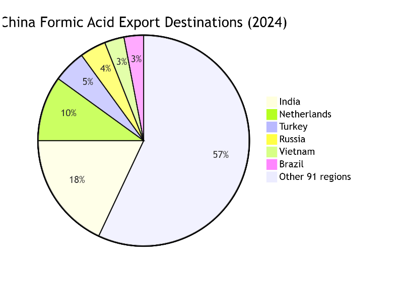 Ang mga umuunlad na ekonomiya tulad ng India, Vietnam, Turkey, Brazil, at Russia ay nakakaranas ng mabilis na paglaki sa pangangailangan para sa formic acid. Gayunpaman, ang mga rehiyong ito ay dumaranas ng matinding kakulangan sa lokal na kapasidad ng produksyon. Noong 2024, ang dami ng formic acid na inangkat lamang ng limang bansang ito mula sa Tsina ay sumakop ng higit sa 30% ng kabuuang eksport ng Tsina, na nagpapakita ng matinding hindi pagkakaayos sa global na istruktura ng suplay at demand.
